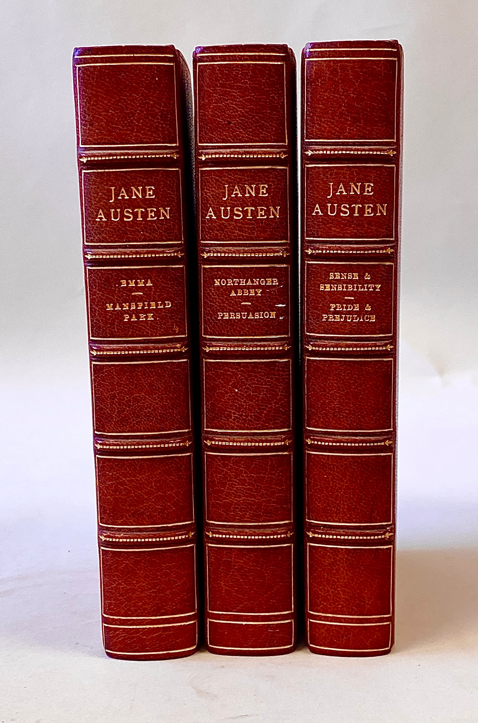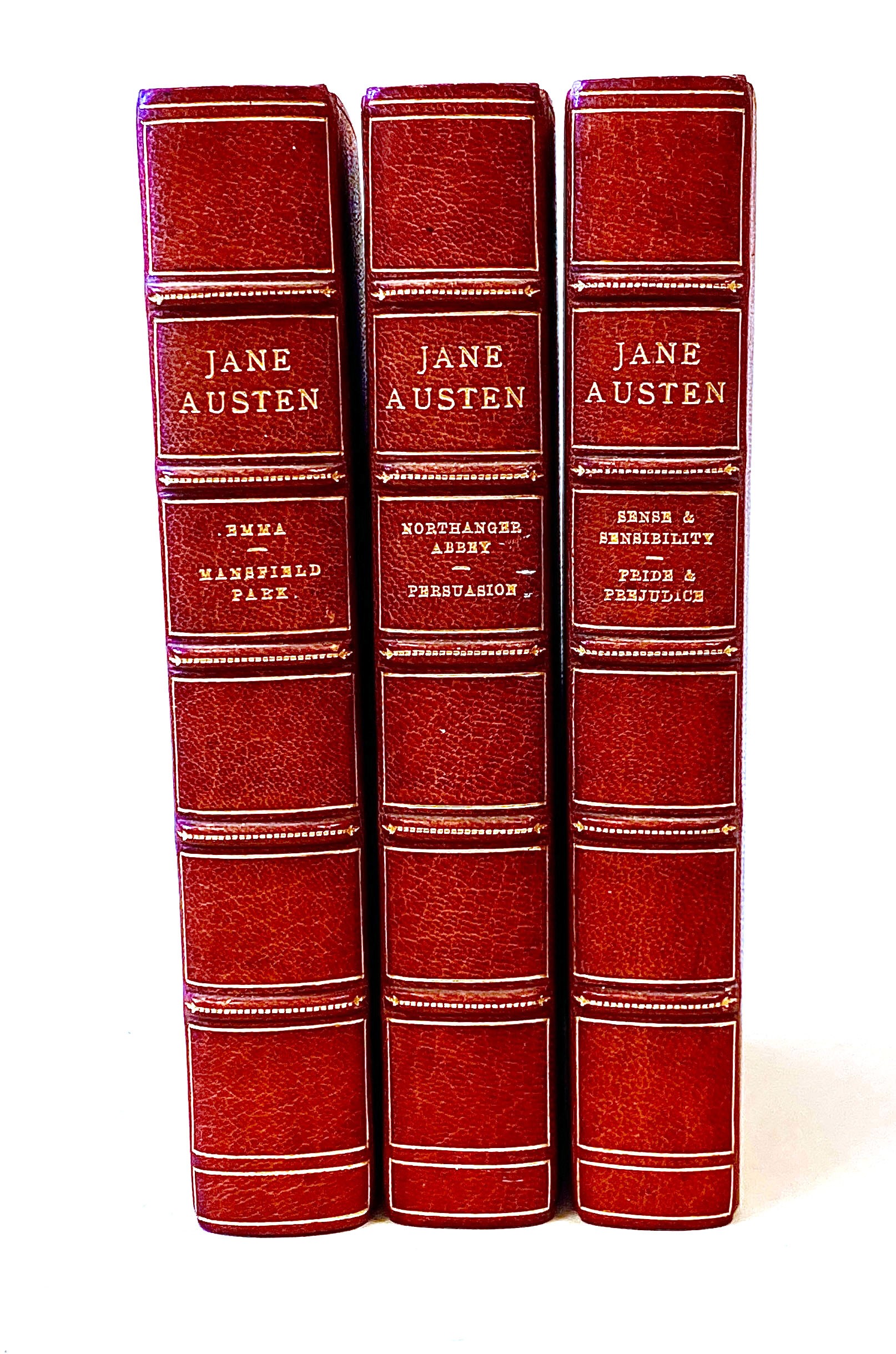 MODERN' BINDINGS, AUSTEN. A superb three vol. set of Austen's six novels bound by Hatchards of Piccadilly and fully gilt to page ends. An ink gift inscr. for 1954. From the Hamish Hamilton novel library series (1947). But the bindings are very fine.