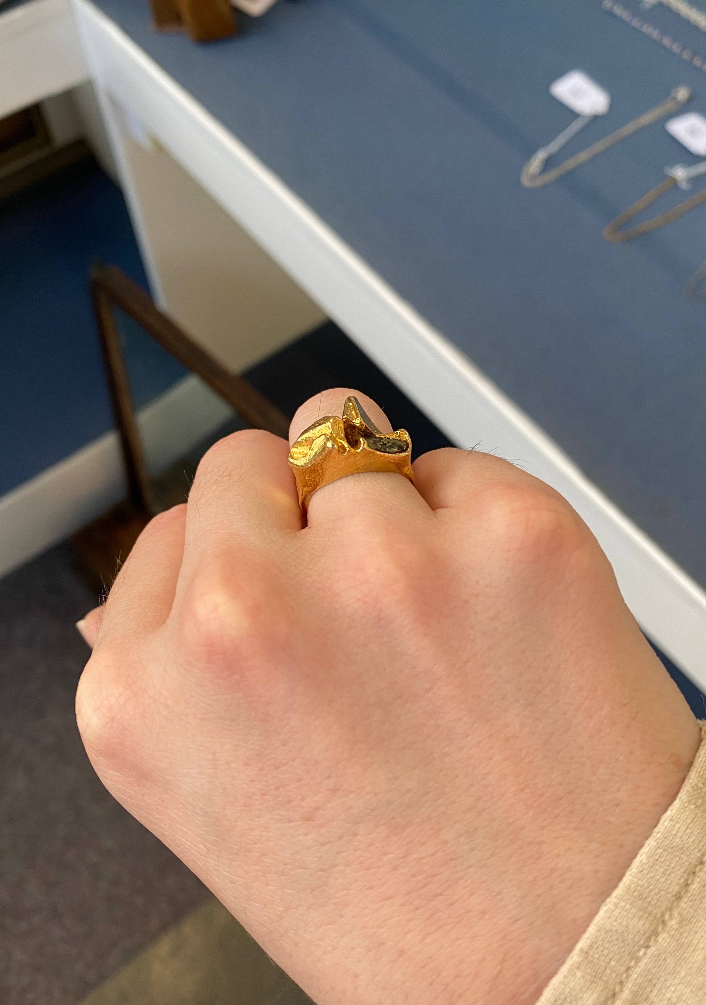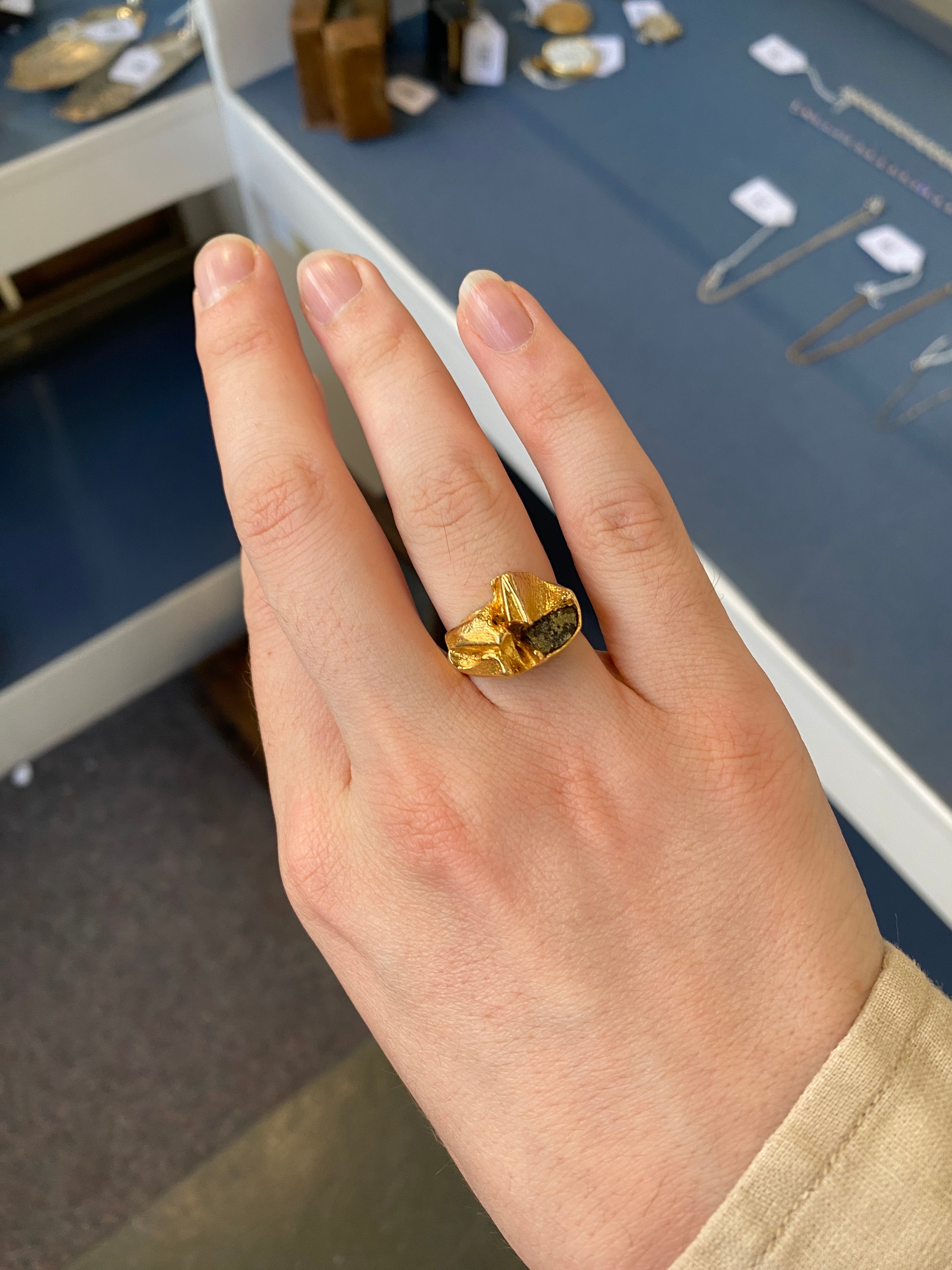 A Bjorn Weckstrom for Lapponia Finnish 18ct gold brutalist ring set with a pyrite nugget, size M 1/2, 7.9g